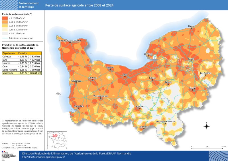 Consommation du foncier agricole : perte de surface agricole entre 2008 et 2024