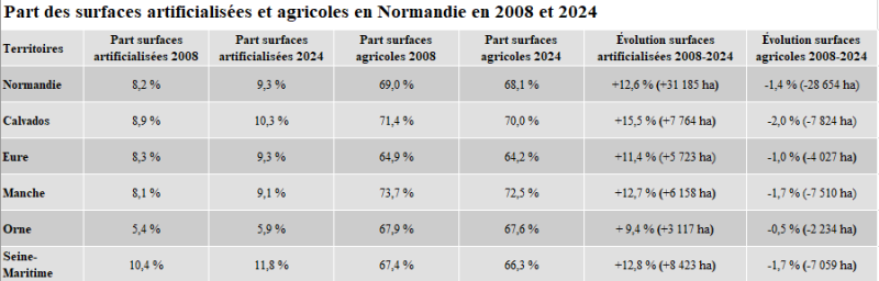 Part des surfaces artificialisées et agricoles en Normandie en 2008 et 2024